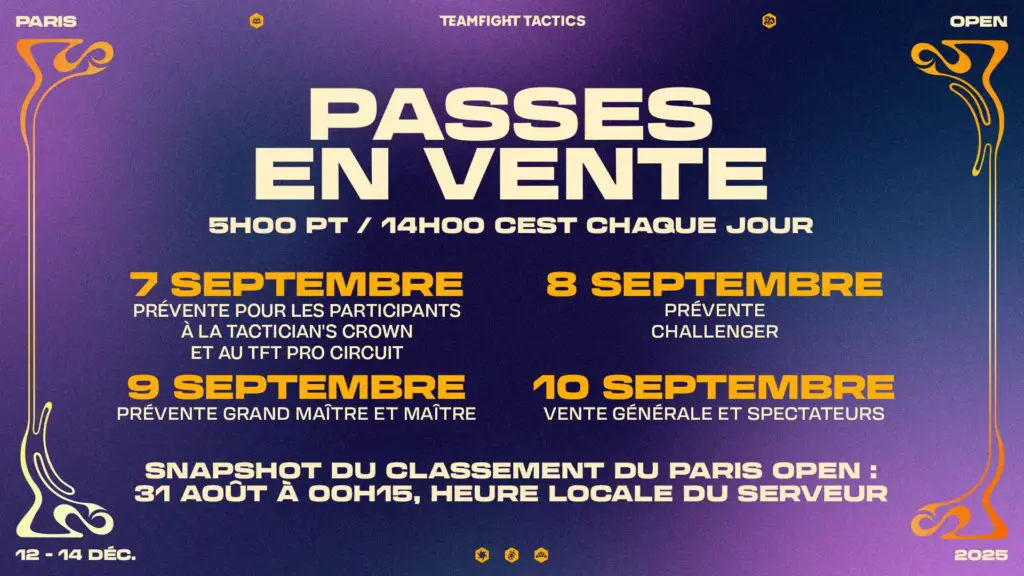 Prévu du 12 au 14 décembre prochain, le TFT Paris Open promet d’être un événement majeur pour les amateurs de Teamfight Tactics. Organisé à Paris Expo Porte de Versailles, ce tournoi réunira 768 joueurs en LAN, attirant des milliers de spectateurs et offrant une cagnotte record de 311 300 dollars. Il s’annonce comme le plus grand tournoi TFT jamais organisé en Europe, avec trois jours de compétition intense et de festivités autour du jeu de stratégie de Riot Games.