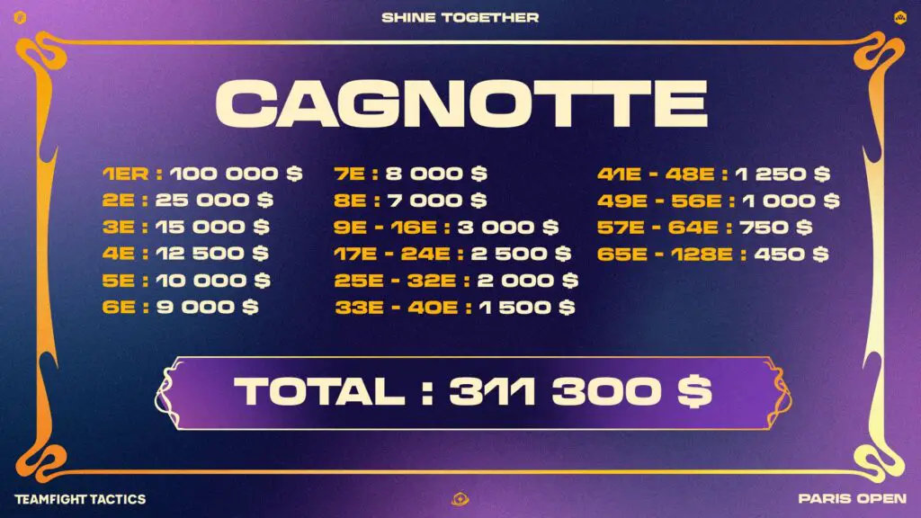 - Cashprize : 311 300 $ (100 000 $ pour le champion)